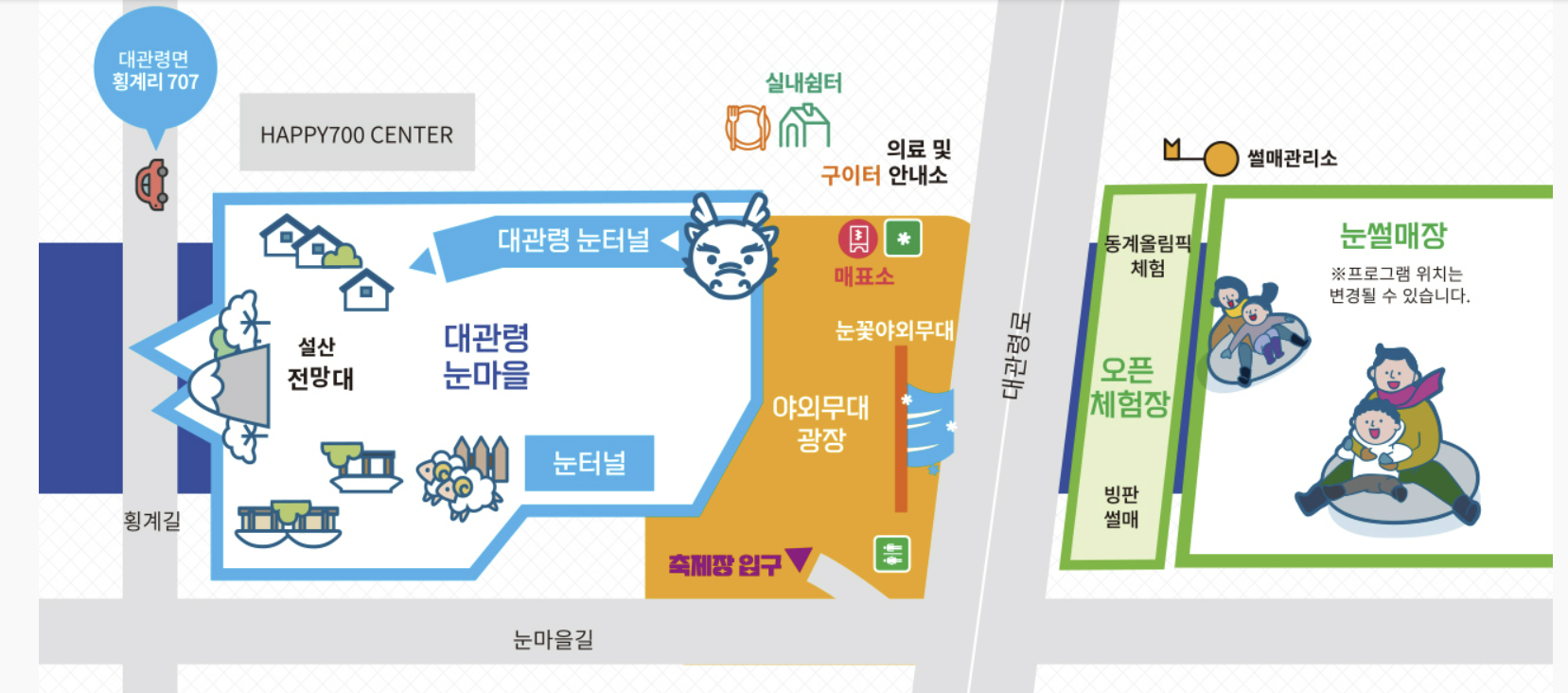 • 대관령눈꽃축제 제1주차장 : 대관령면 횡계리 707(올림픽메달프라자)
