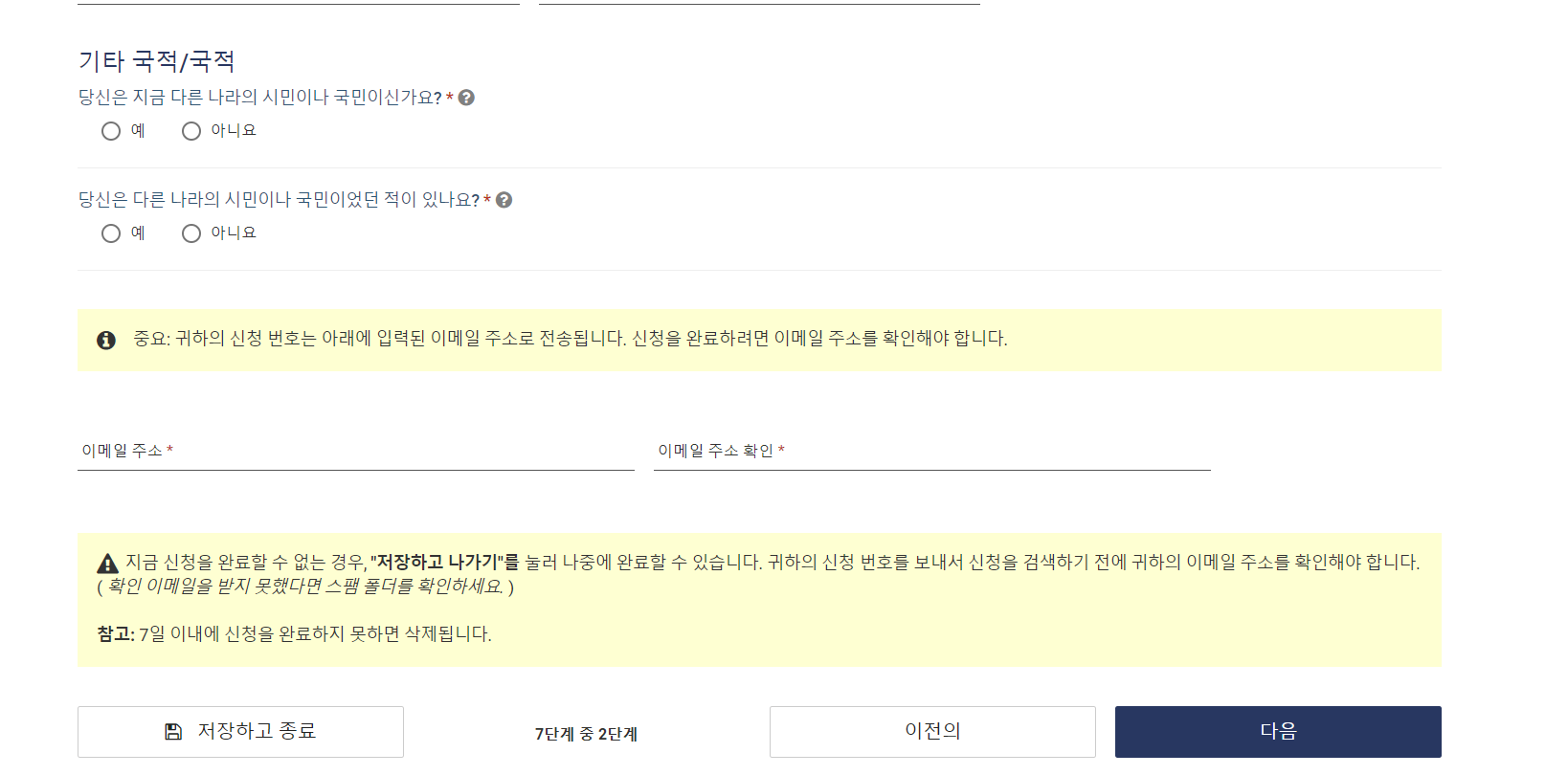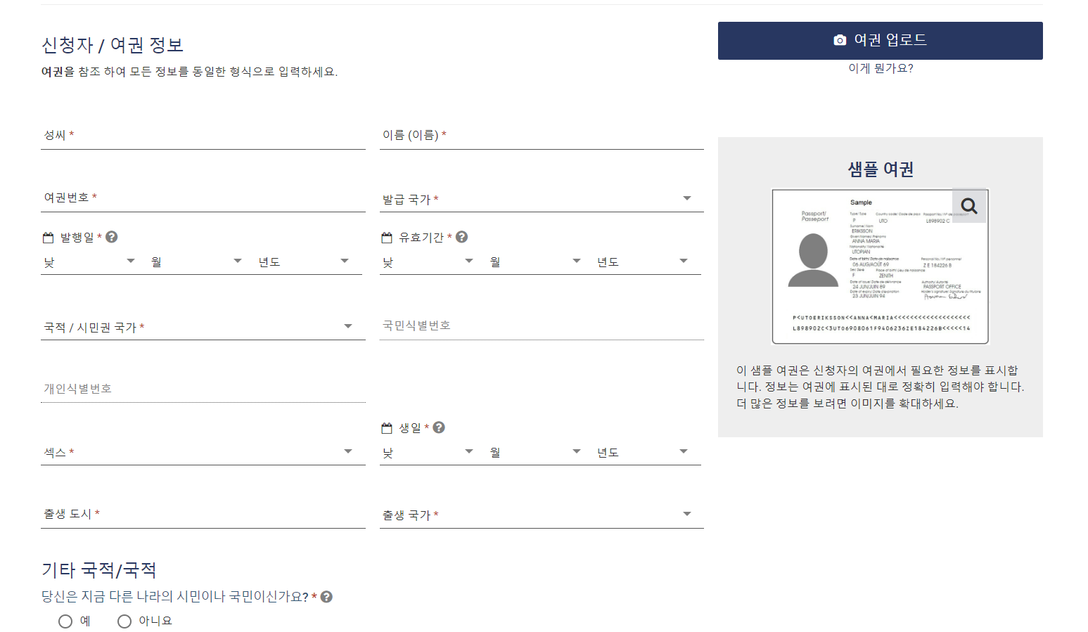 여권 정보 및 개인 정보 입력 및 여행 일정 및 체류 정보 입력