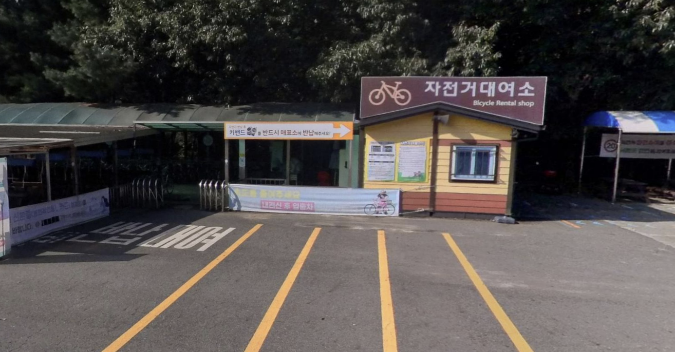 자전거 대여소는 공원 정문 오른쪽 방향에 위치해 있습니다.