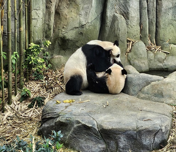 리버원더스엔 귀여운 판다들도 있었는데 마침 두 마리가 장난치고 놀고 있었어요.