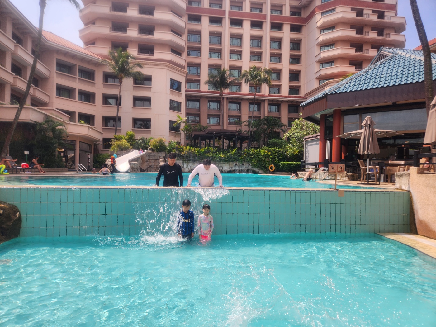 어른수영장 아래 유아풀장이 바로 있는데 아빠가 위에서 폭포만들어주고