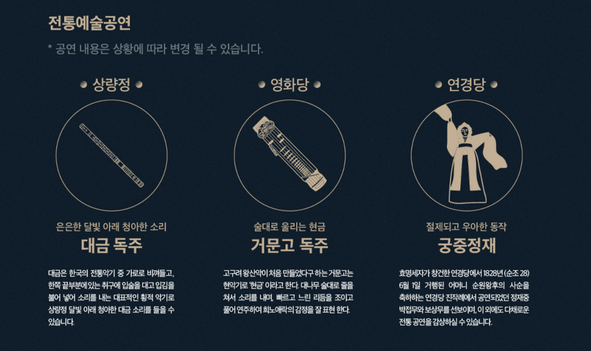 창덕궁 달빛기행 프로그램으로 전통예술공연, 해설 탐방 등 특별 프로그램들이 진행됩니다.