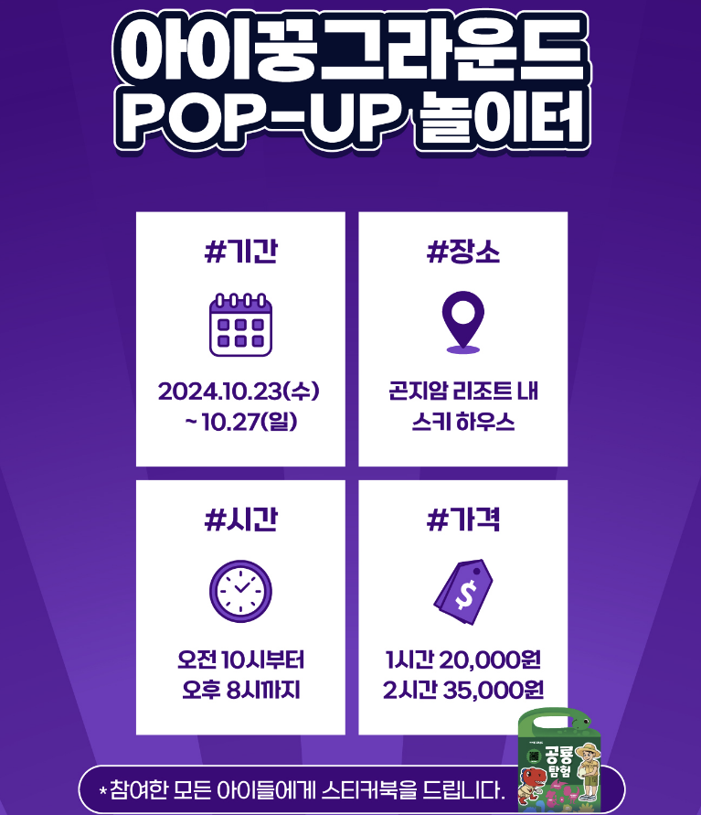 곤지암 리조트는 가족 단위의 여행객을 위한 다양한 프로그램도 마련되어 있습니다. 예를 들어, 키즈 우주탐험 팝업 이벤트와 같은 특별한 테마 행사들이 자주 개최되며, 어린이 놀이터 등 아이들이 즐길 수 있는 공간도 마련되어 있어 가족 단위로 방문하기 좋습니다.